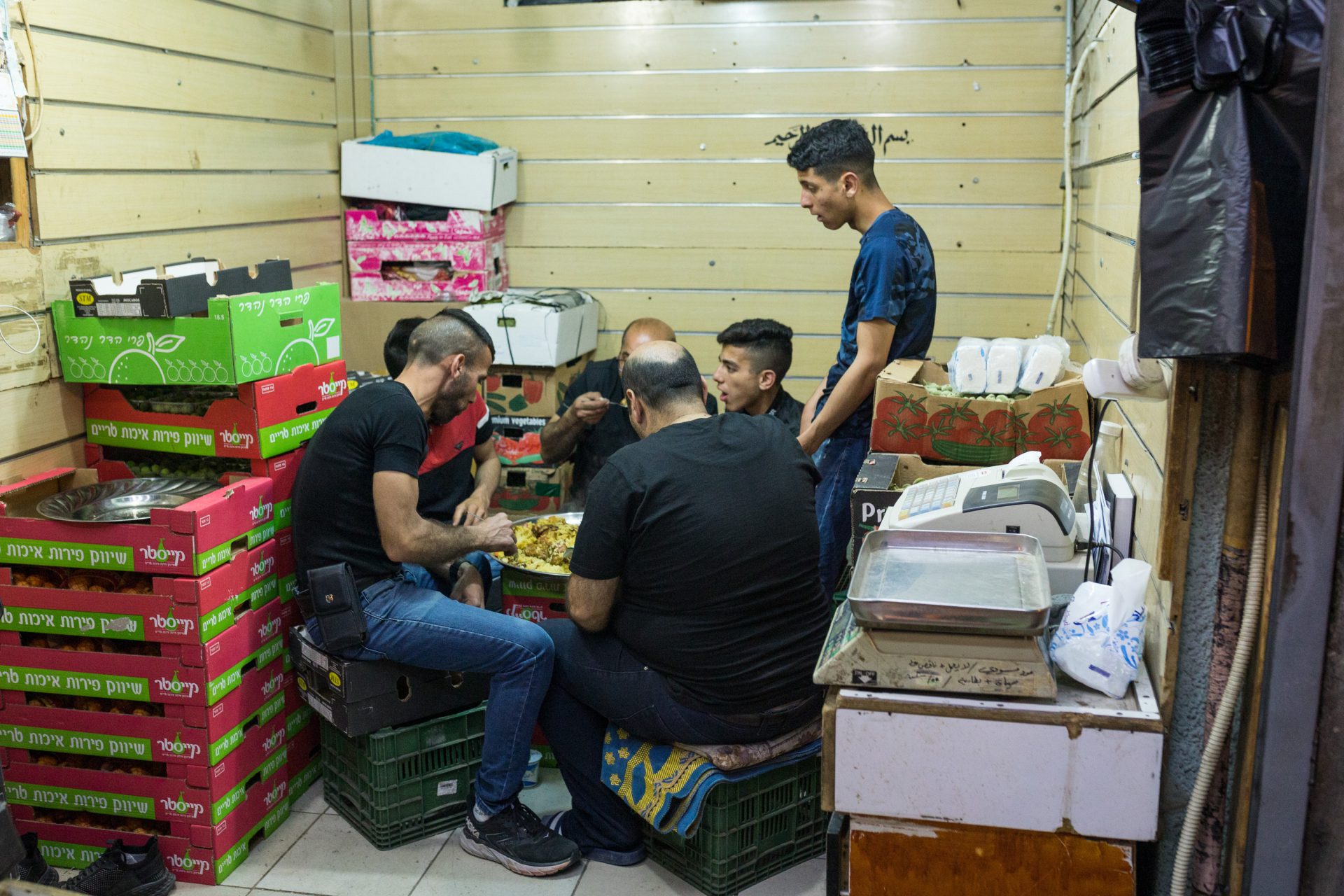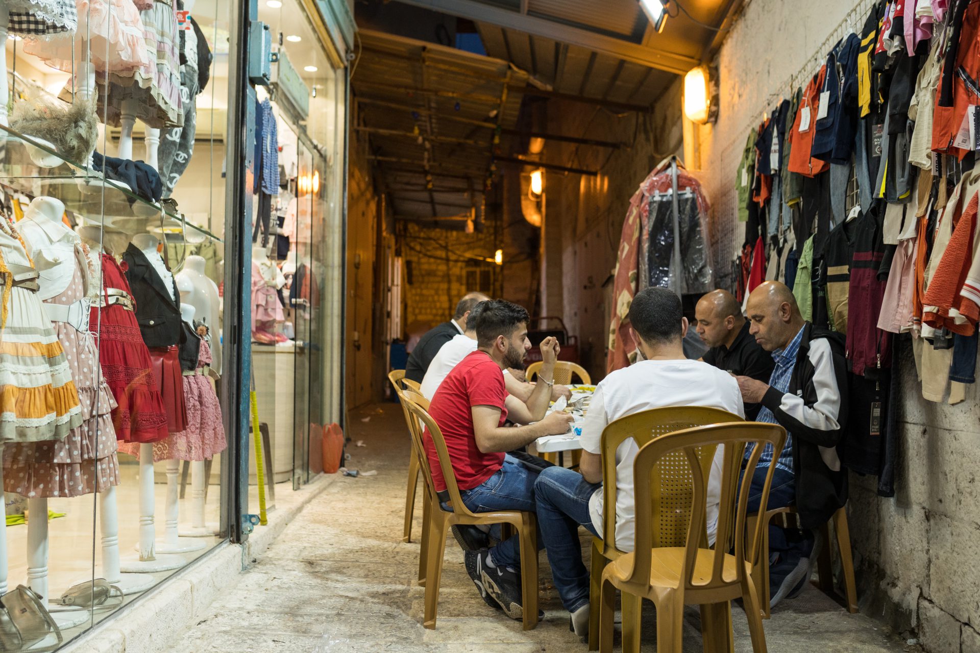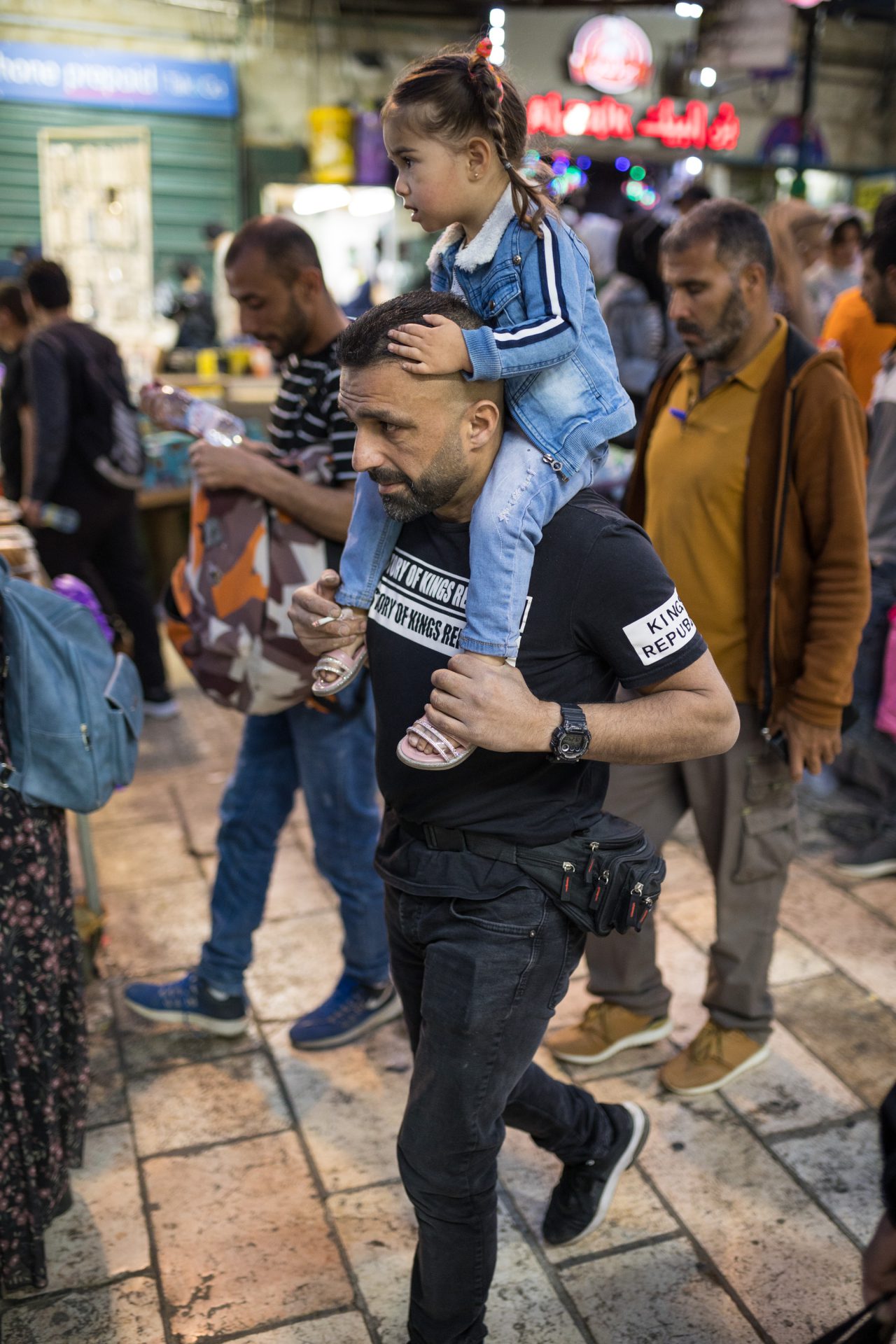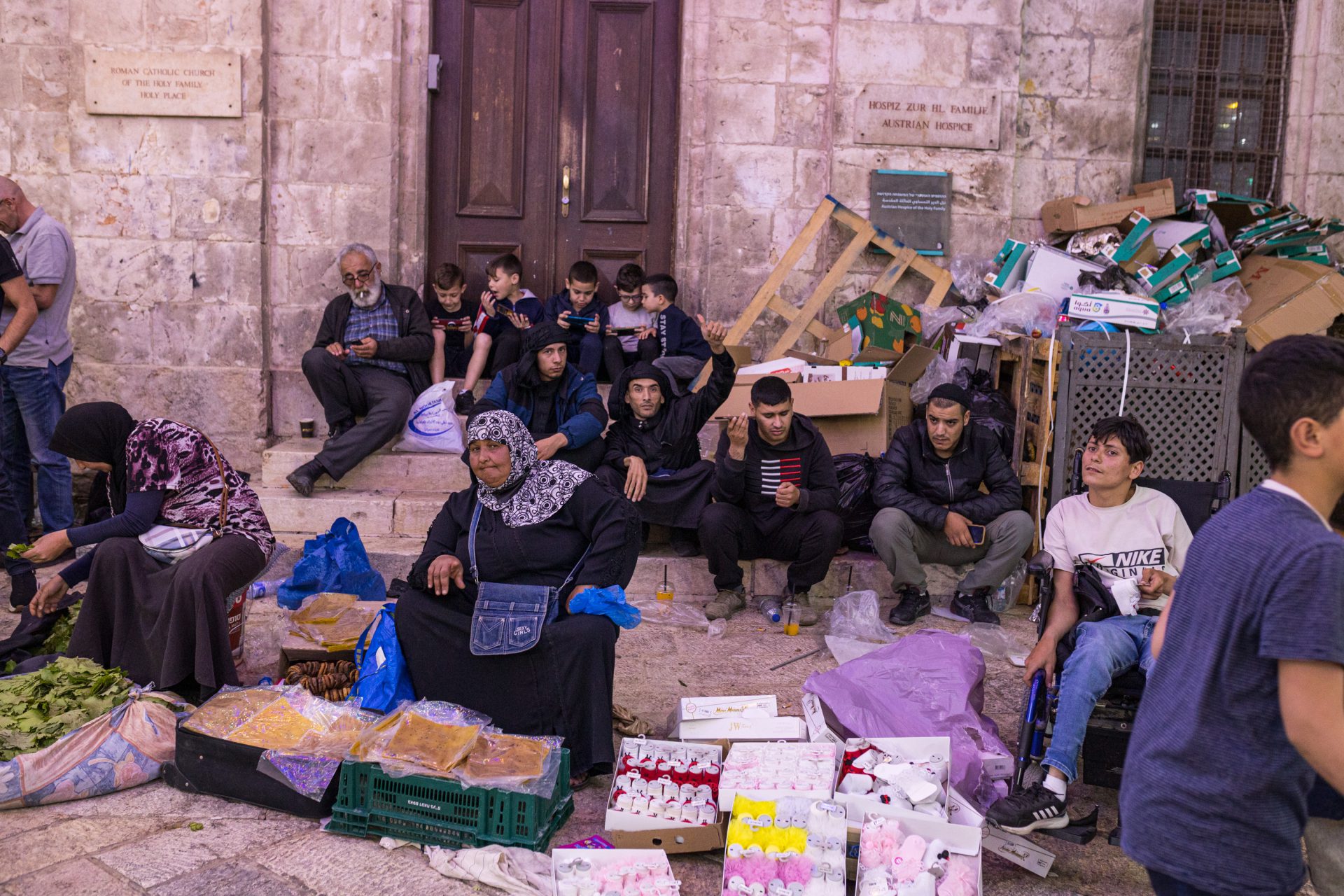 As I kept walking towards the entrance to al-Aqsa, the alleys became narrower and more crowded. Occasionally I had to walk out of the crowds into a side alley to take a break from the hustle and bustle. One of those short breaks into a market alley gave me a chance to photograph the Iftar (meal that ends the daily fast) of the shop owners. Fathers and sons, workers and employers, sat among the jewelry, clothes and souvenirs and broke bread together.