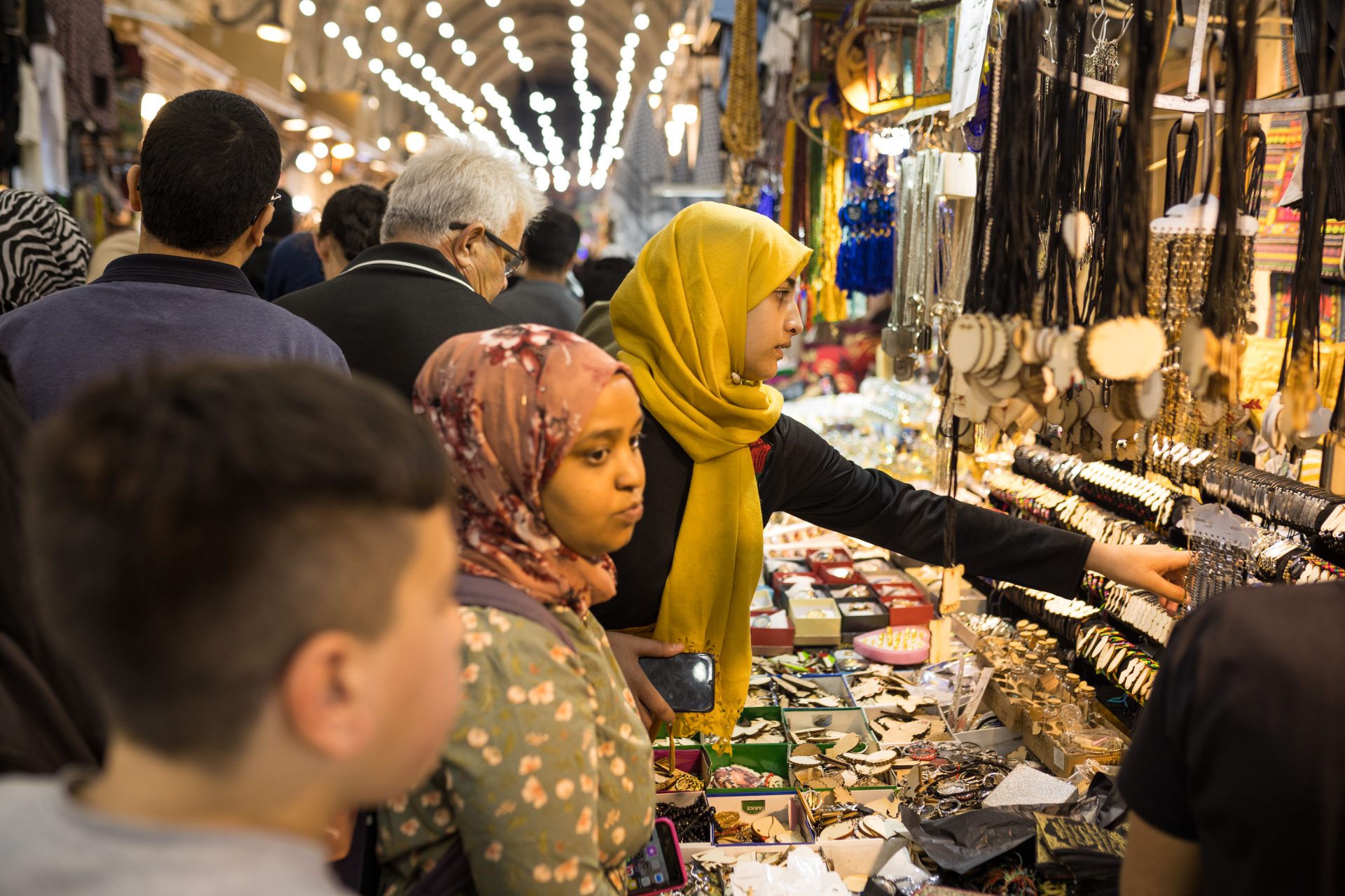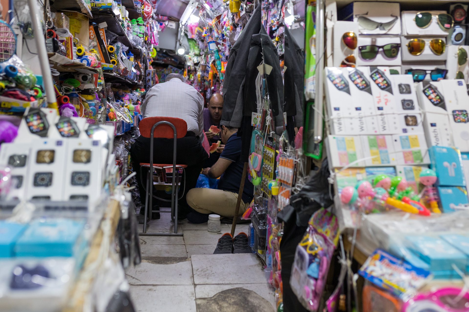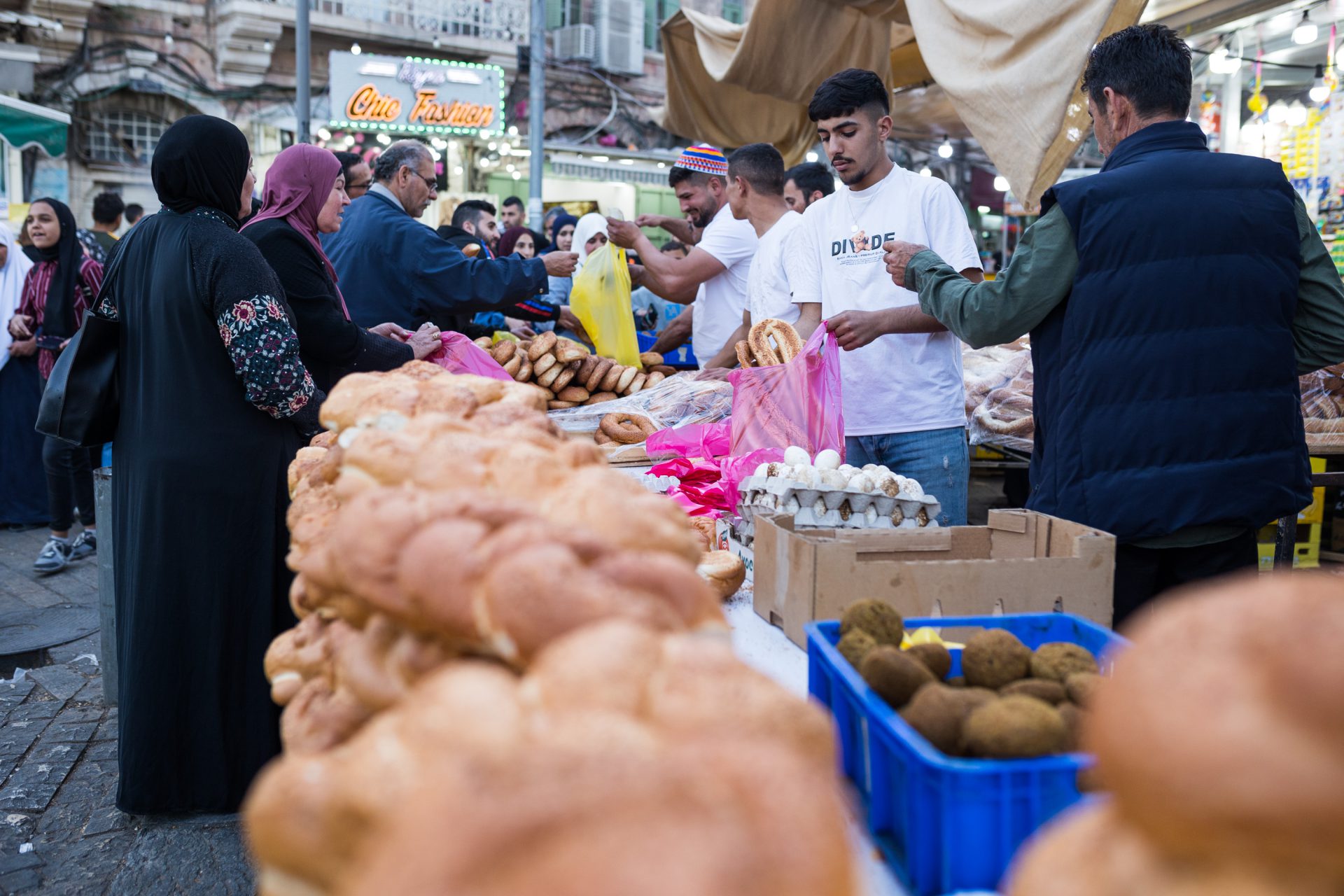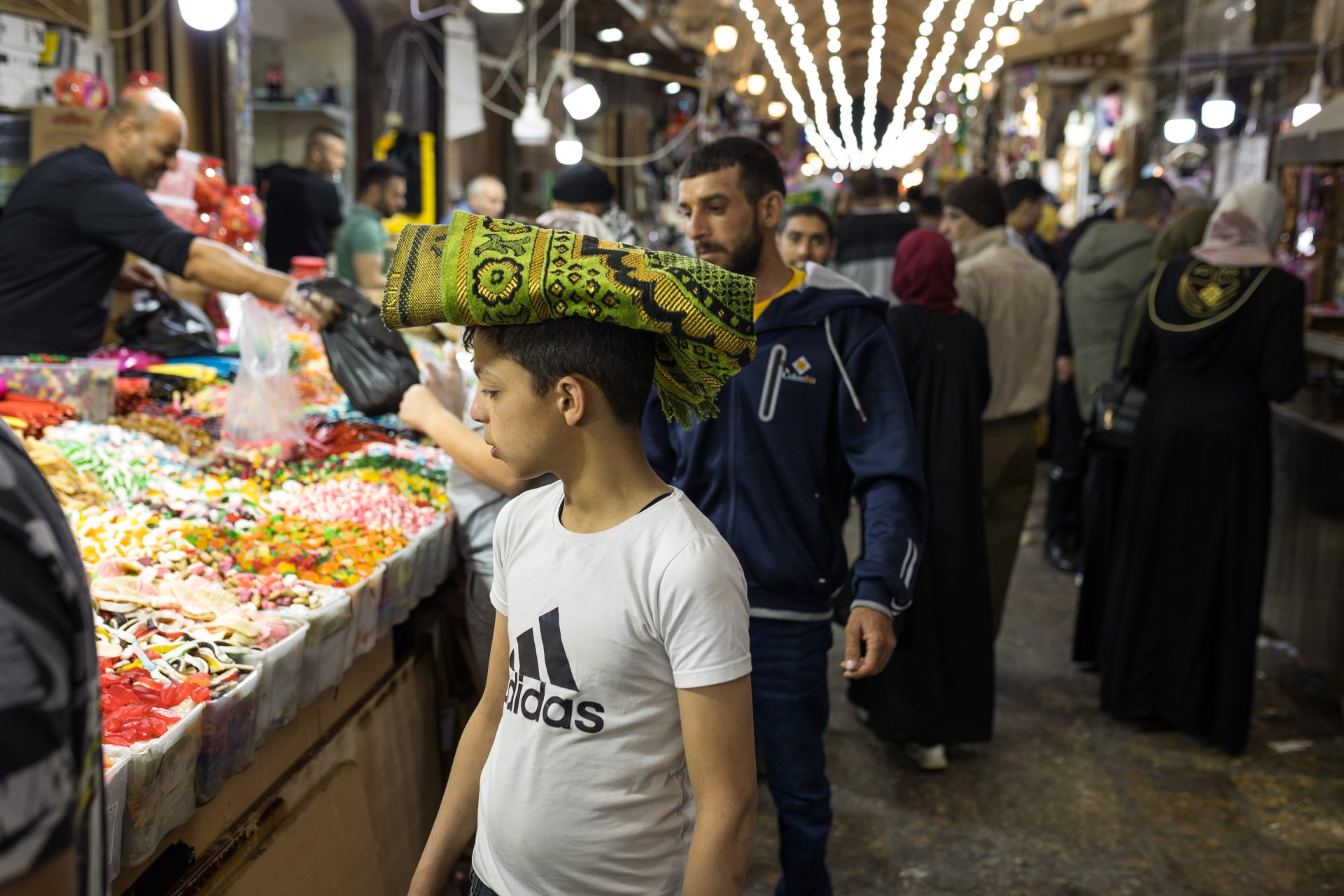 As I kept walking towards the entrance to al-Aqsa, the alleys became narrower and more crowded. Occasionally I had to walk out of the crowds into a side alley to take a break from the hustle and bustle. One of those short breaks into a market alley gave me a chance to photograph the Iftar (meal that ends the daily fast) of the shop owners. Fathers and sons, workers and employers, sat among the jewelry, clothes and souvenirs and broke bread together.