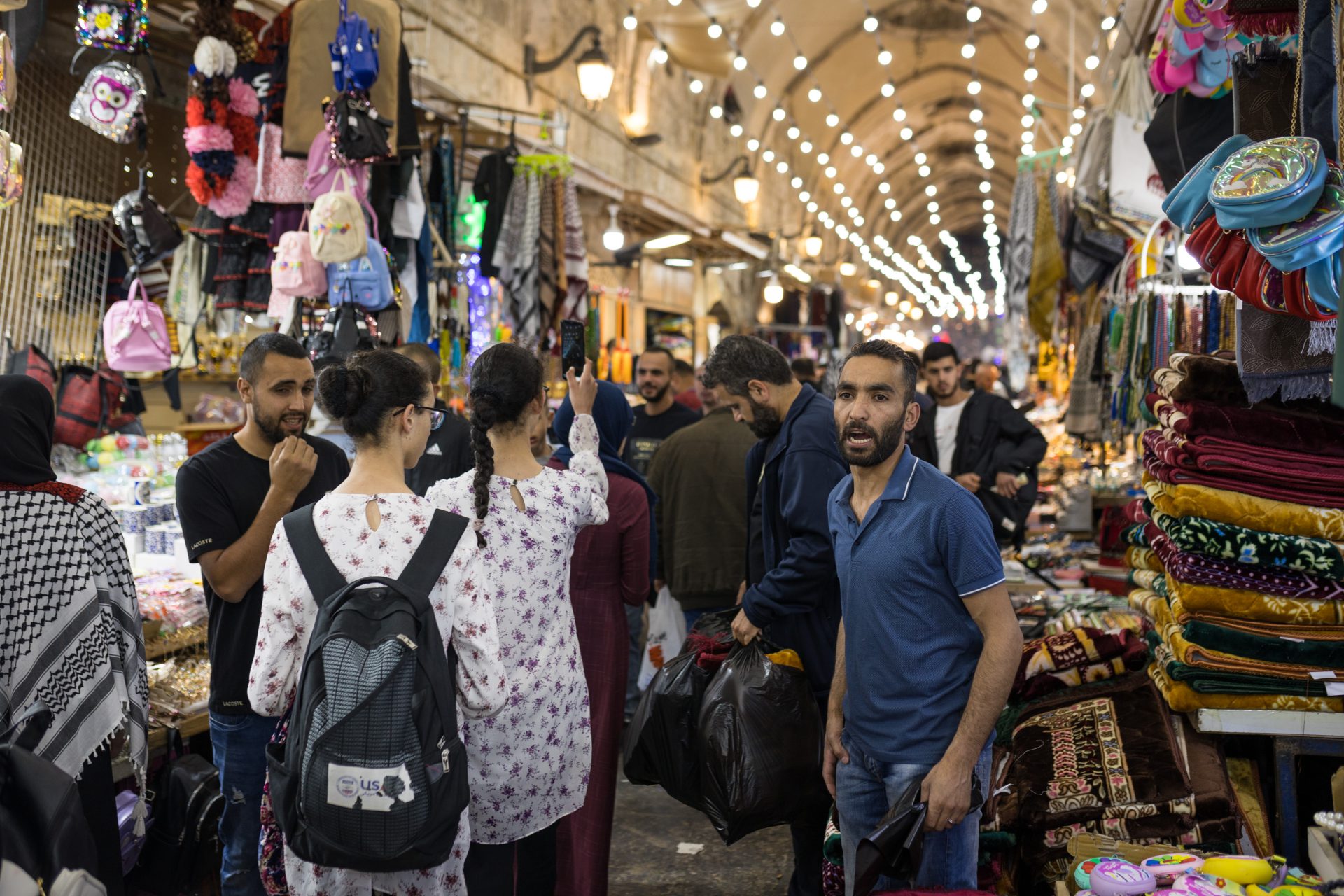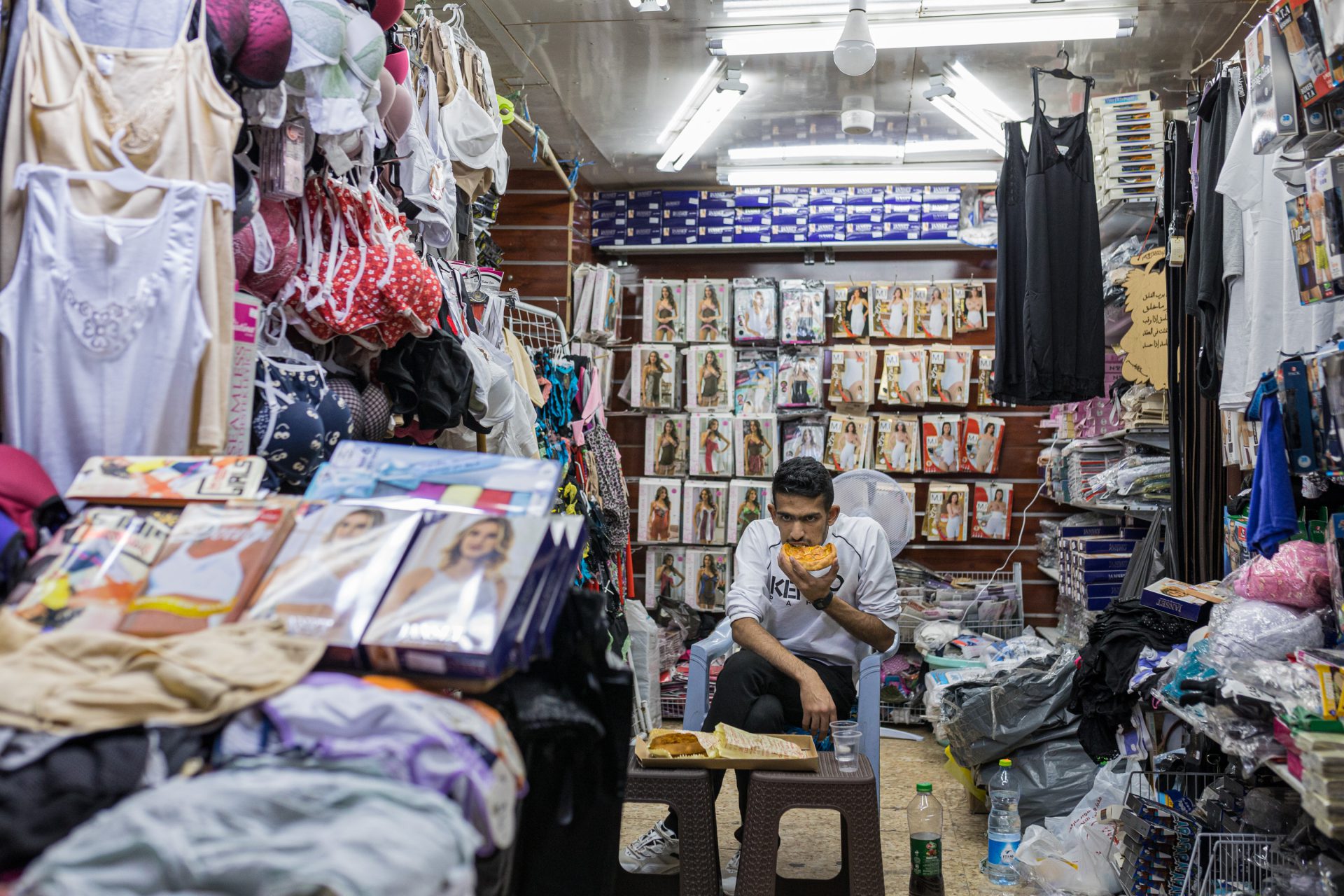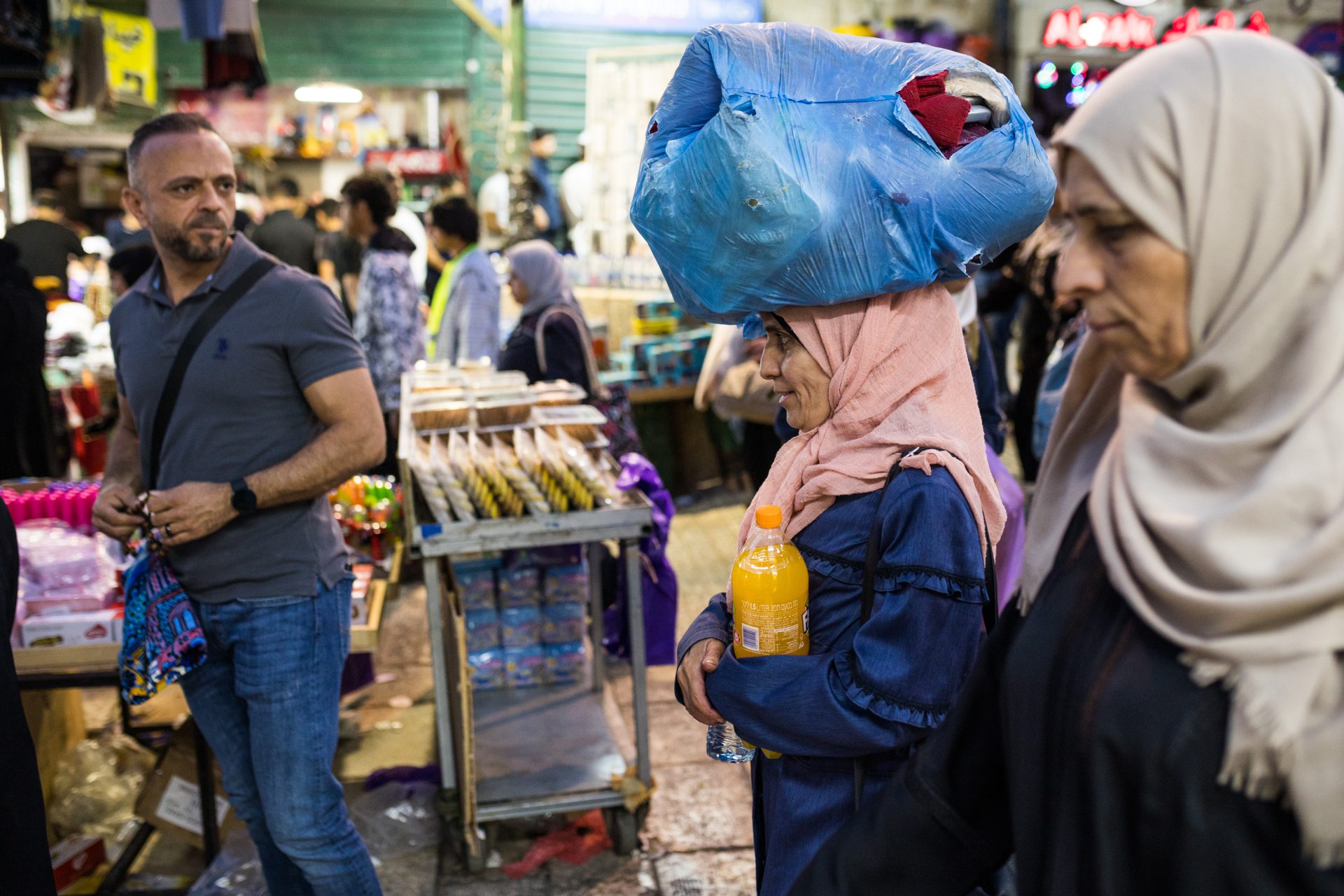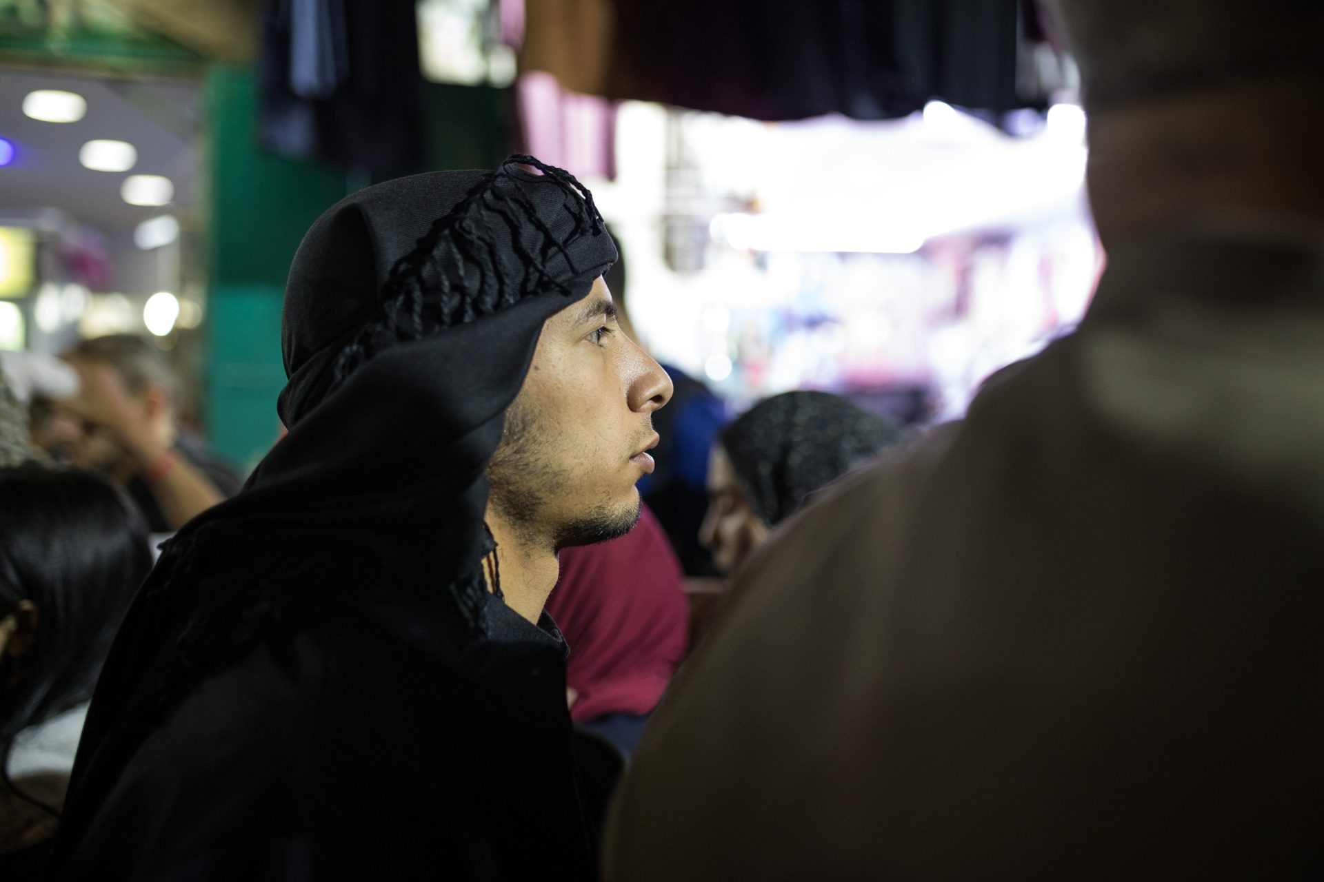 As I kept walking towards the entrance to al-Aqsa, the alleys became narrower and more crowded. Occasionally I had to walk out of the crowds into a side alley to take a break from the hustle and bustle. One of those short breaks into a market alley gave me a chance to photograph the Iftar (meal that ends the daily fast) of the shop owners. Fathers and sons, workers and employers, sat among the jewelry, clothes and souvenirs and broke bread together.