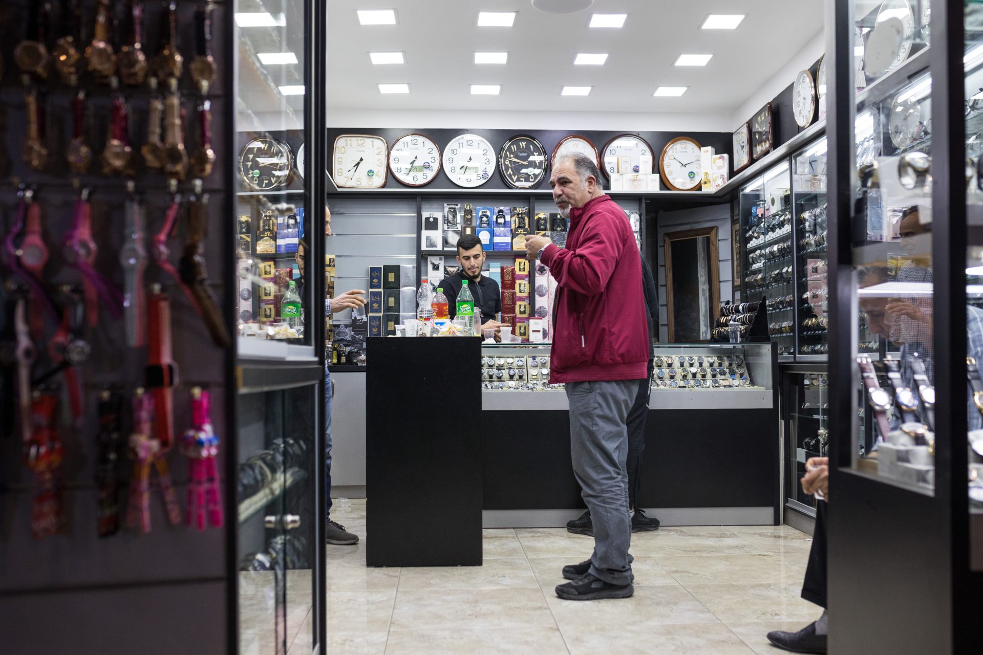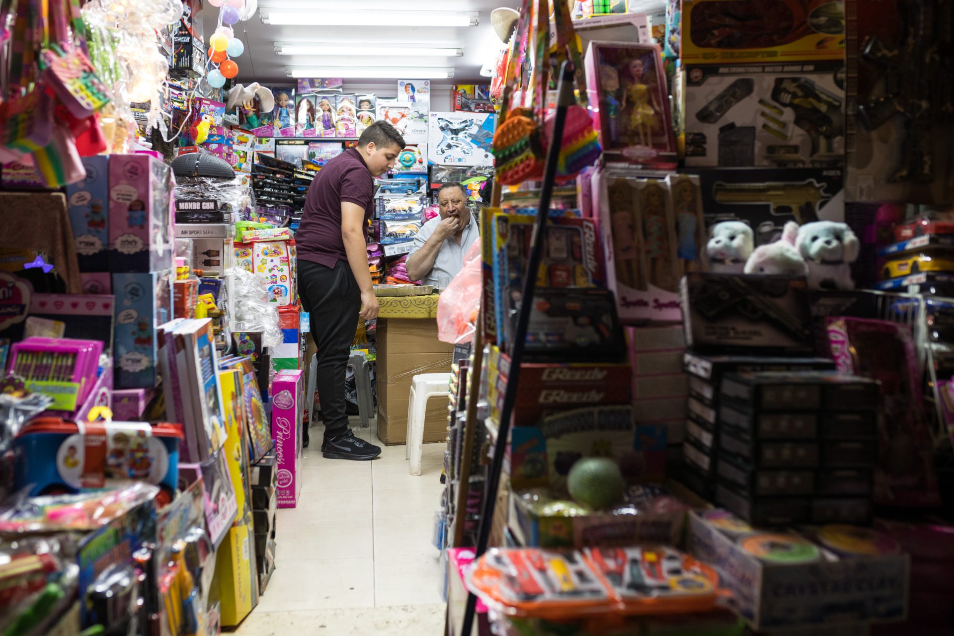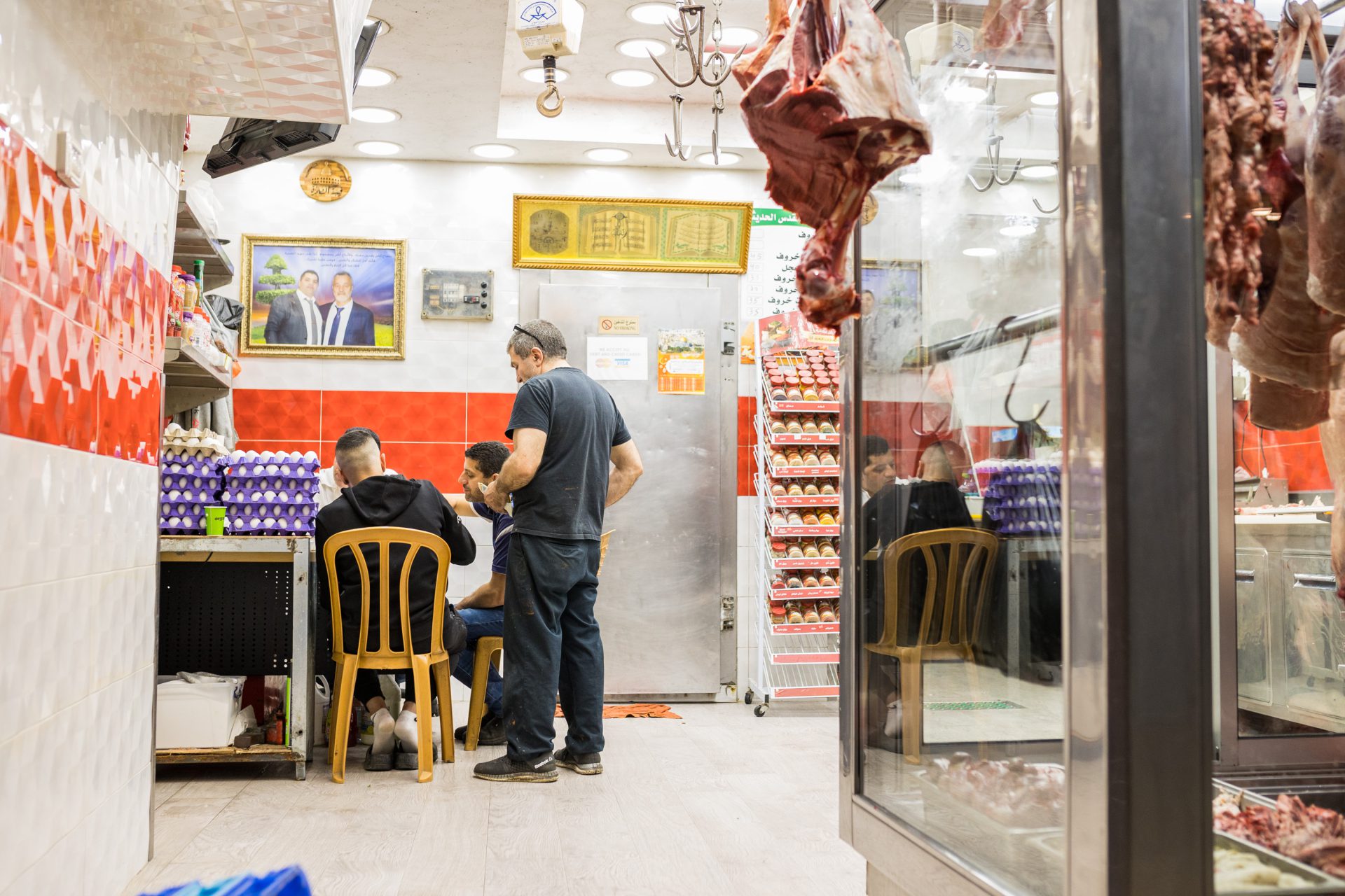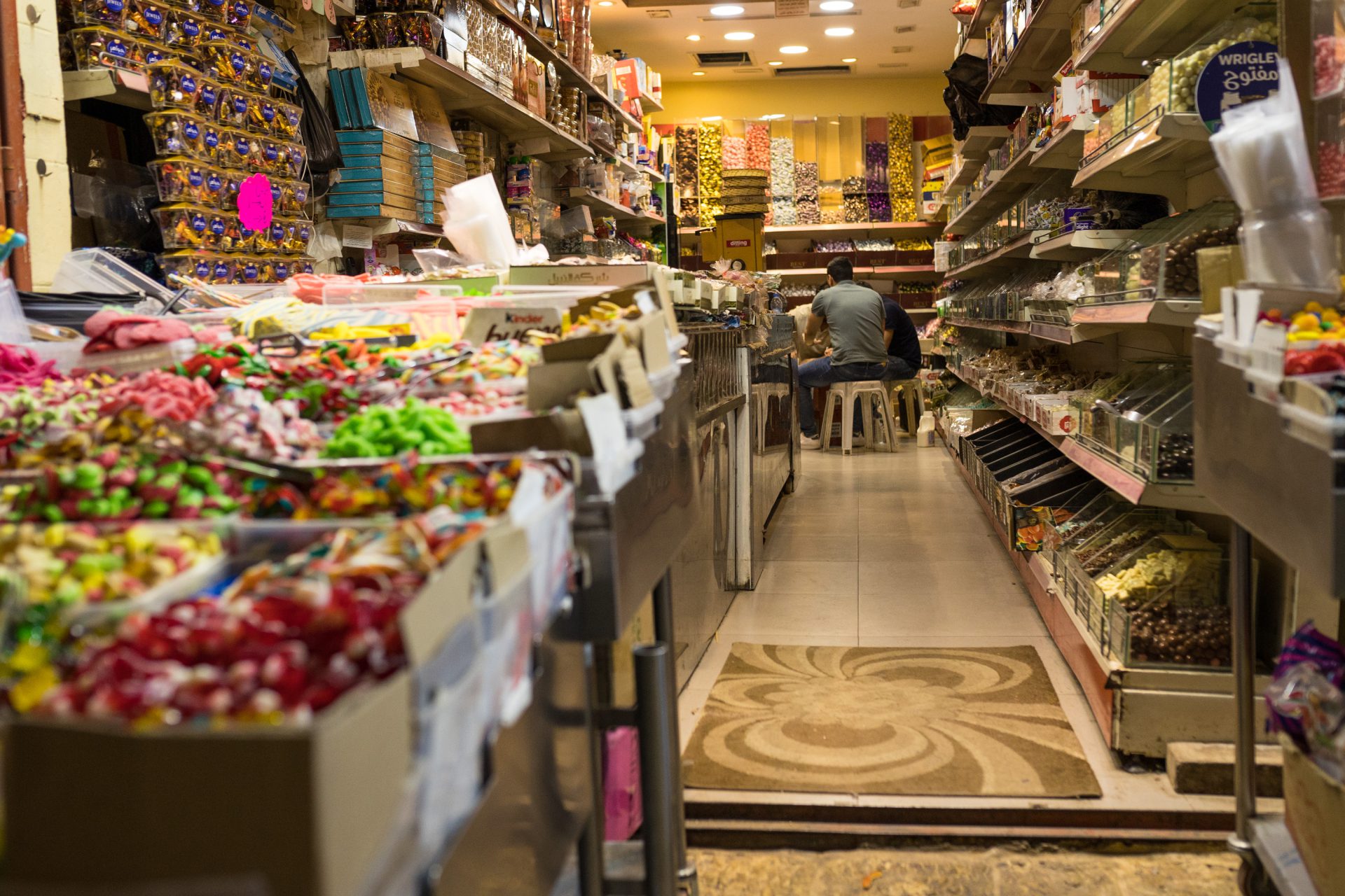 As I kept walking towards the entrance to al-Aqsa, the alleys became narrower and more crowded. Occasionally I had to walk out of the crowds into a side alley to take a break from the hustle and bustle. One of those short breaks into a market alley gave me a chance to photograph the Iftar (meal that ends the daily fast) of the shop owners. Fathers and sons, workers and employers, sat among the jewelry, clothes and souvenirs and broke bread together.